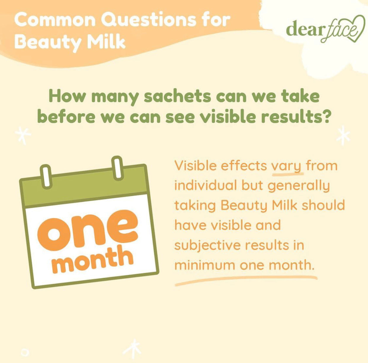 In a glass of cold or hot water, mix 1 sachet of Beauty Milk, stir thoroughly. Take once a day for 1 month straight for best results.