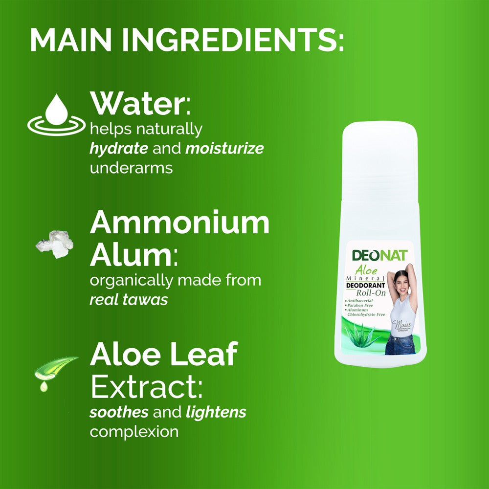 DEONAT Aloe Mineral Deodorant Roll-On is made from natural mineral salts which provide all day protection against odour-causing bacteria. It is non-sticky, non-staining and does not clog body pores.