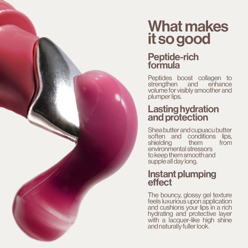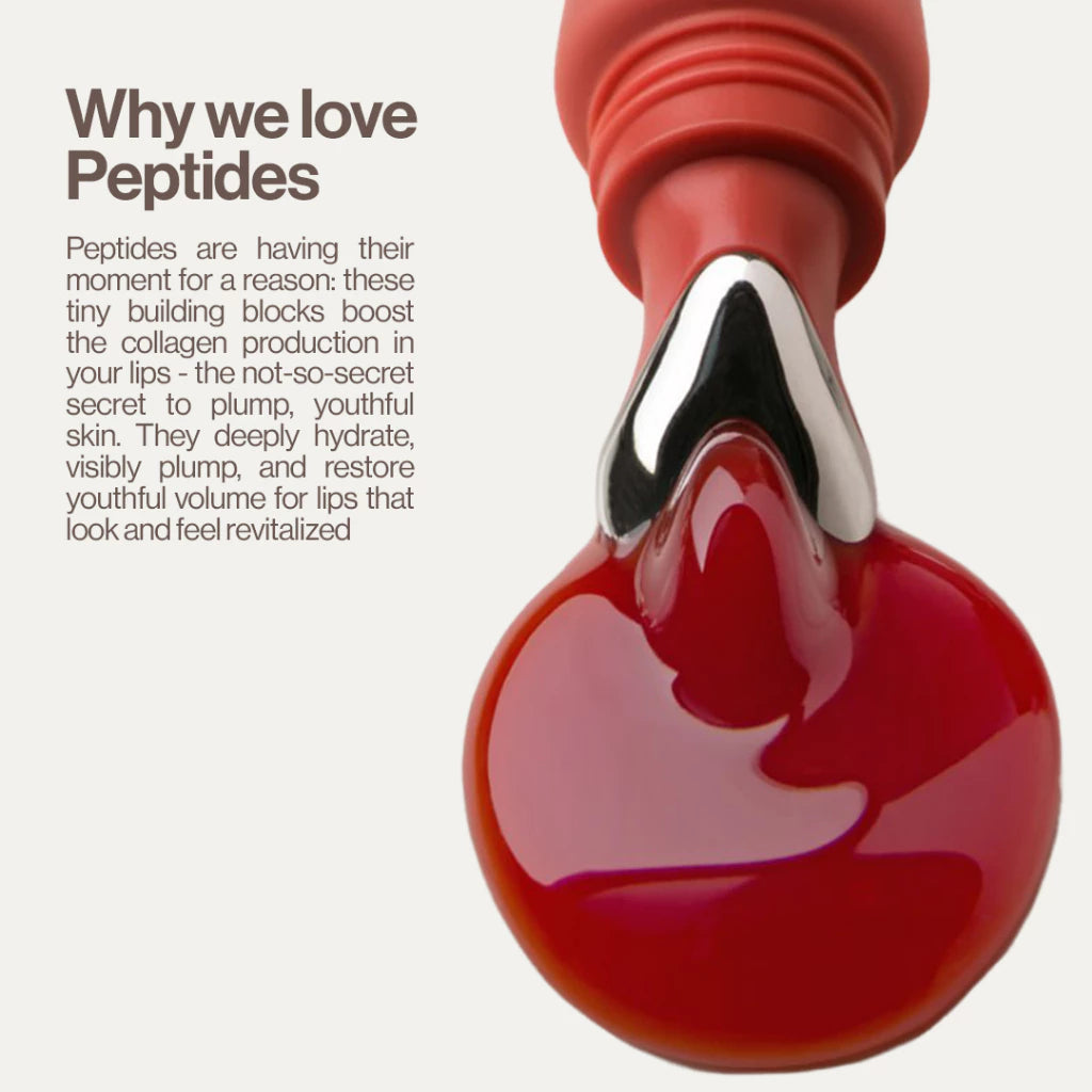 a nourishing, peptide lip treatment in a glossy finish with a cooling metal applicator.
