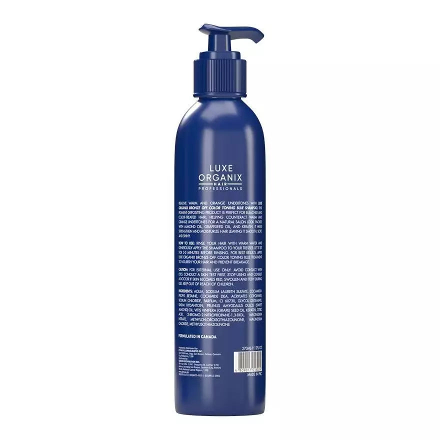 Remove warm and orange undertones with luxe organix bronze off color toning blue shampoo. this pigment-depositing product is perfect for bleached and color-treated hair helping counteract warm and orange undertones for a natural salon look. packed with almond oil grapeseed oil and keratin it helps strengthen and moisturize hair leaving it smooth soft and shiny.