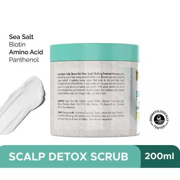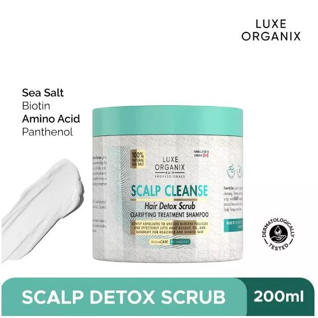 Luxe Organix Scalp Cleanse Hair Detox Scrub Clarifying Treatment Shampoo gently exfoliates the scalp to help unclog blocked follicles and effectively prevent buildup that causes dandruff. It regulates excess sebum that leads to oily and flaky scalp. Formulated with Sea Salt and Biotin, it helps to detoxify the scalp and stimulate keratin production to help rebuild and restore hair growth. With added benefits from Amino Acid to strengthen hair and Panthenol to boost moisture, this revitalizing hair treatment promotes healthier scalp with stronger, fuller, and shinier hair.
